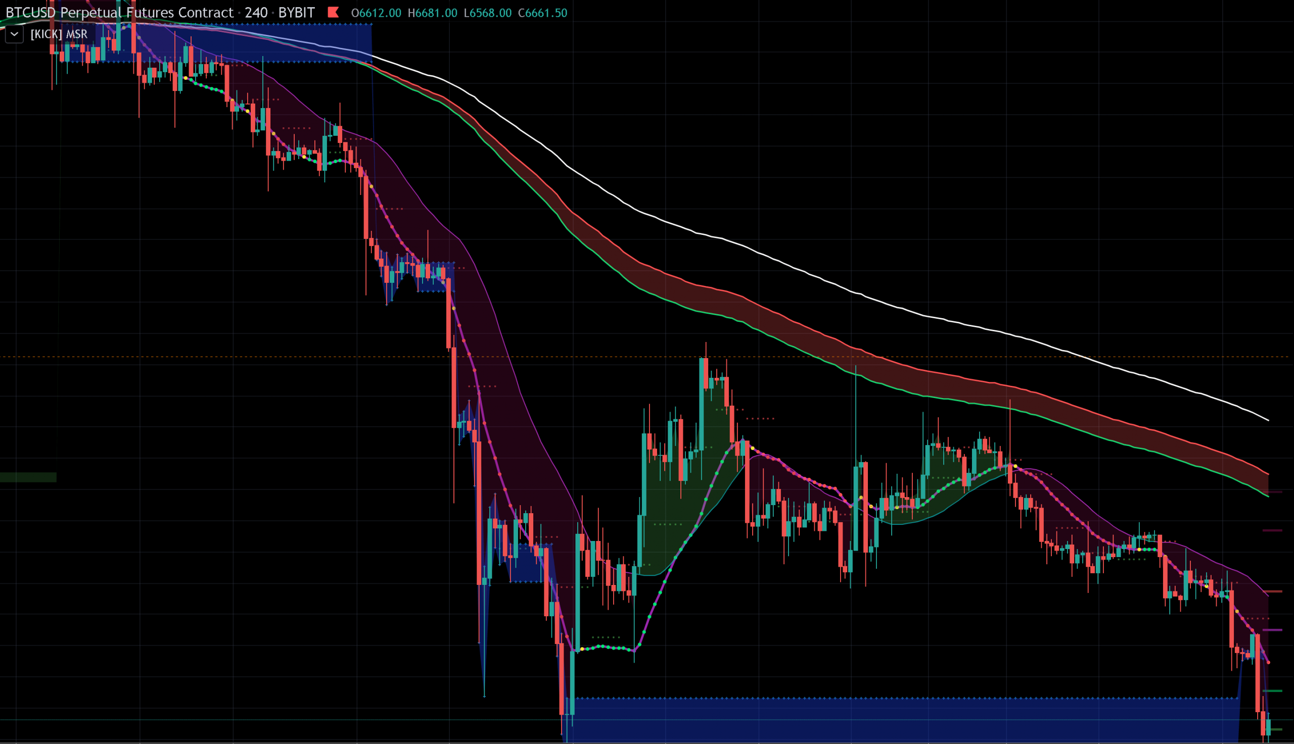 - Vegas Wave (144/169/233) – The fill between the 144 and 169 changes red/green depending on if price action is bullish or bearish. There are numerous ways to trade the vegas wave. It is included here to be used as a S/R tool, but can be used to help fine wave 3’s and C waves with Elliott Wave theory, etc…