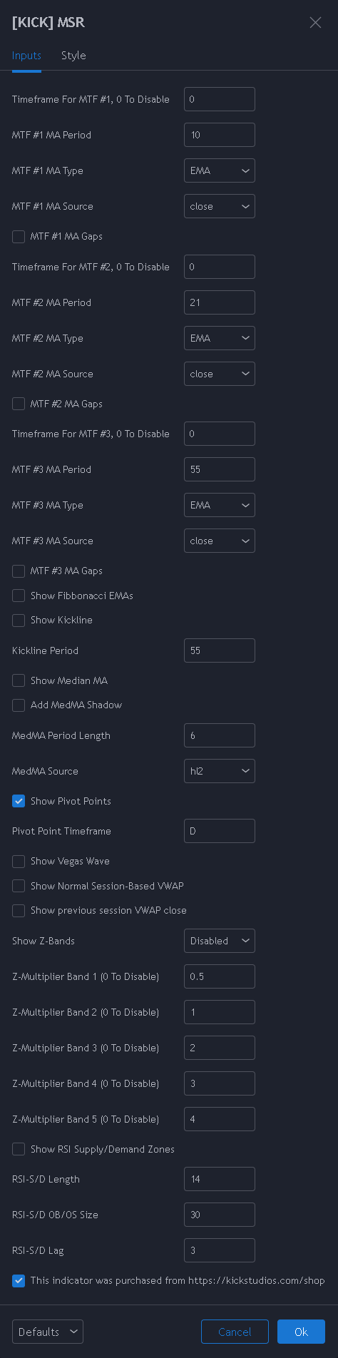 - Pivot Points (for any timeframe) – Use the same notation as with the MTF SMA/EMA’s above. E.g. 30=30 minutes, 720=12 hours, D=Daily, 3D=3 day, W=Weekly, M=Monthly, etc… We have found the mostly useful pivots in most markets are 4 hour, Daily, and Weekly.